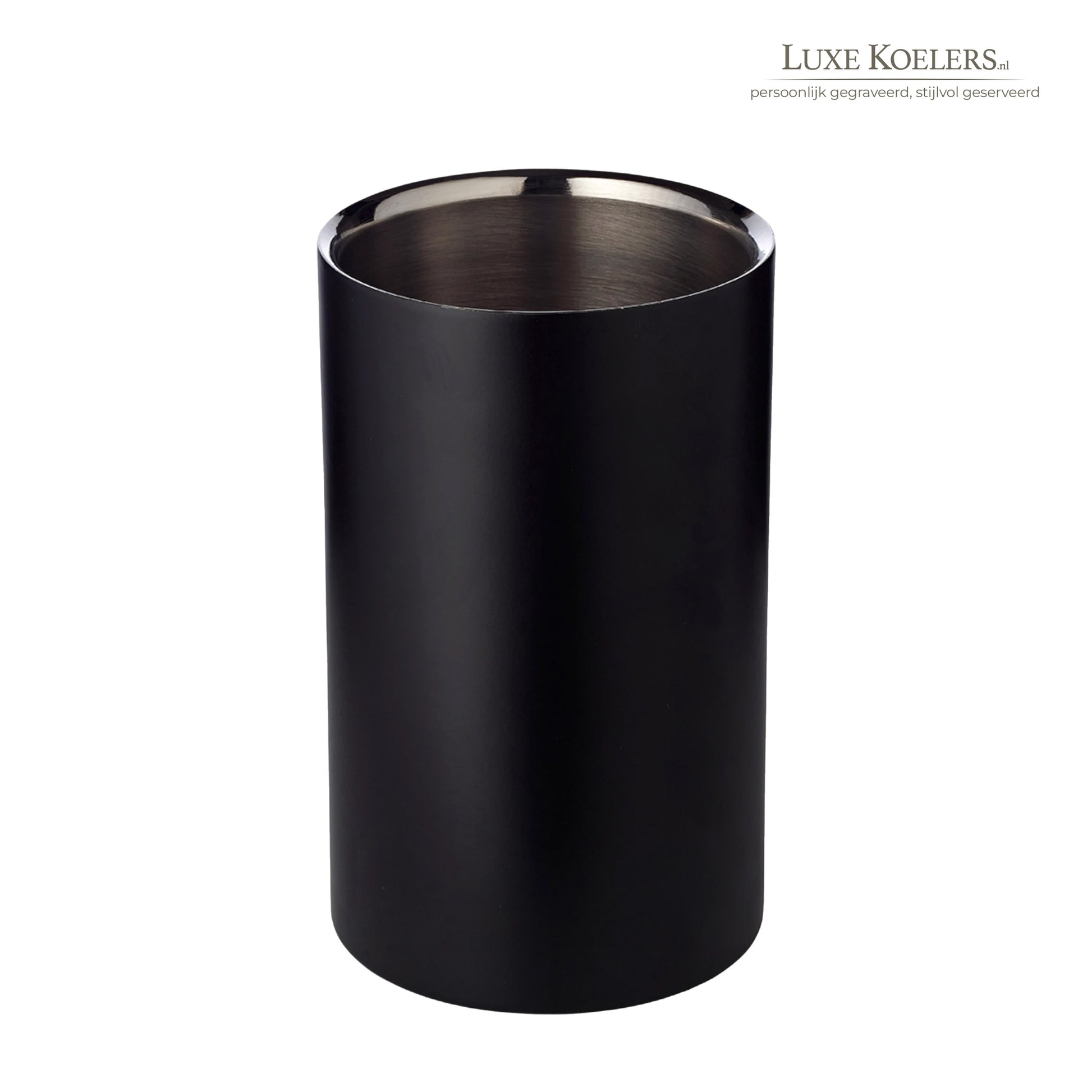 Deze zwarte koeler kunnen wij graveren met onze lasermachine. Dit geeft de mogelijkheid om heel gedetailleerd te graveren. Met deze techniek branden we de zwarte laag weg waardoor het zilver tevoorschijn komt. Het moderne, matzwarte design met subtiele glans voegt direct stijl toe aan elke setting – van een intiem diner tot een feestelijke gelegenheid.